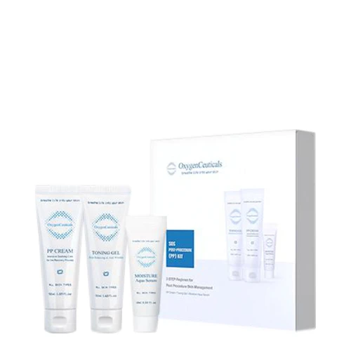 An easy-to-carry kit containing best-seller items (Toning Gel, Moisture Aqua Serum, PP Cream) in OxygenCeuticals for a daily skincare routine, TSA-approved size.